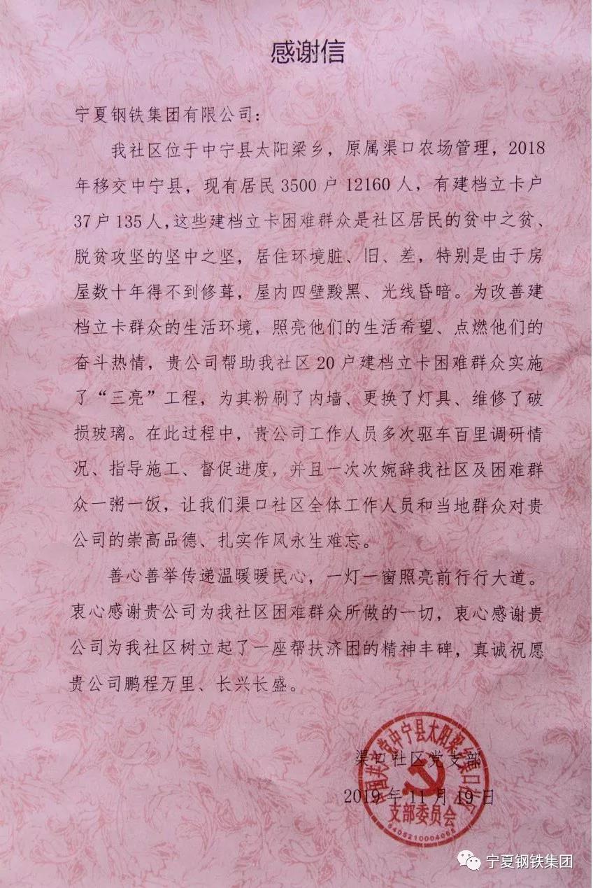 近日,寧夏鋼鐵(集團)有限責任公司(以下簡稱“寧鋼集團)工會在中衛(wèi)市中寧縣太陽梁鄉(xiāng)渠口社區(qū)開展“三亮”工程,幫助該社區(qū)內20戶建檔立卡困難群眾改善生活居住環(huán)境。
