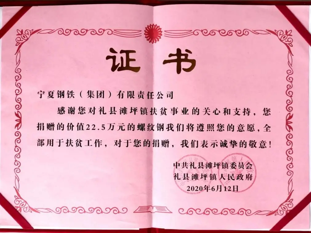 此次捐贈(zèng)是對(duì)甘肅省禮縣灘坪鎮(zhèn)進(jìn)行黨建扶貧工作,公司總經(jīng)理參加并出席了捐贈(zèng)儀式,以22.5萬元的鋼材助力該鎮(zhèn)黨建設(shè)施建設(shè)。